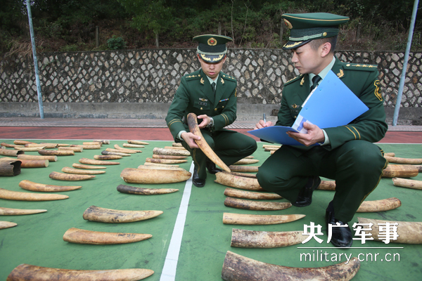 边防官兵正在对查获的走私象牙进行核对登记。周捷摄
