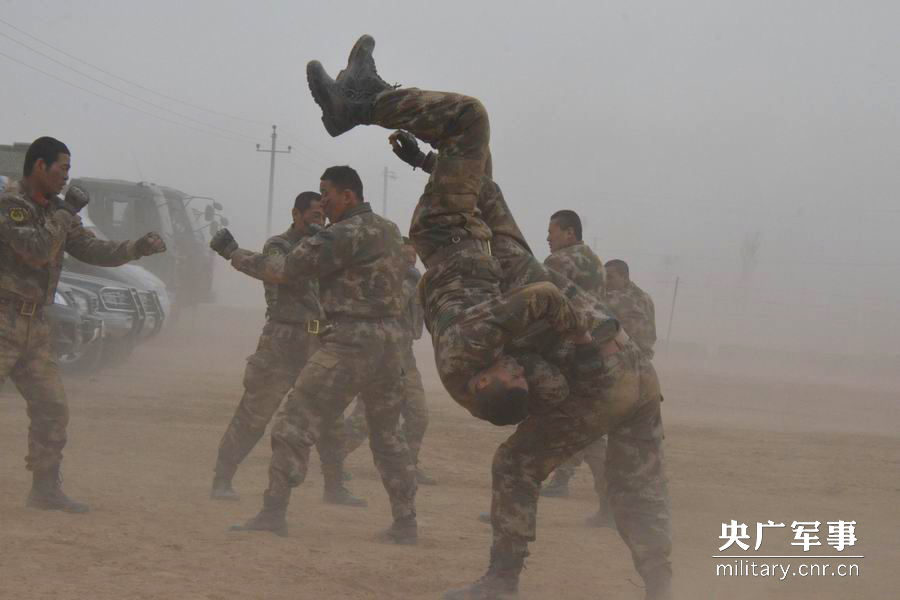 图为3月16日官兵在恶劣天气下进行摔擒训练。张亚雄 摄