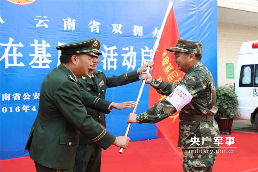 央广网云南4月14日消息 (王文跃 朱雄)为扎实开展“双拥在基层”活动,进一步弘扬驻滇部队拥政爱民优良传统,积极帮助基层官兵、重点优抚对象、困难群众解决看病难、就医贵等现实问题,切实保障改善民生、促进社会和谐、展现部队风采,4月14日,云南省双拥办、省公安边防总队举行“健康基层行、双拥在基层”活动启动仪式,并为医疗义诊分队授旗。