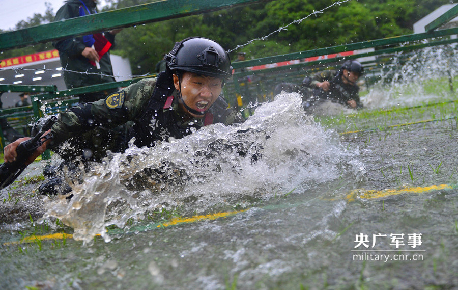 央广网广东5月16日消息 (廖健) 没有一支部队比这支部队更受天气的眷顾!天公作美,献上一场橙色预警级暴雨,为这支南粤劲旅快反班(组)军事竞赛献礼。近日,2016年度广东边防总队机动支队中队快反班(组)军事竞赛在深圳银湖山训练基地的磅礴大雨中开幕。驻守在粤港澳边海防一线的武警特战队员摸爬滚打,在暴雨中展开较量,此次比赛为期两天,共设置了负重接力、快反小组对抗射击、抓绳攀登、紧张出动等8个课目,24支队伍、共计600多人参赛。