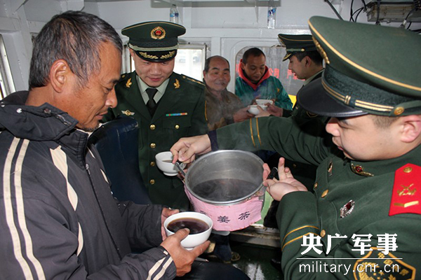 图为边防官兵为台胞准备御寒姜茶。陈虹宇摄