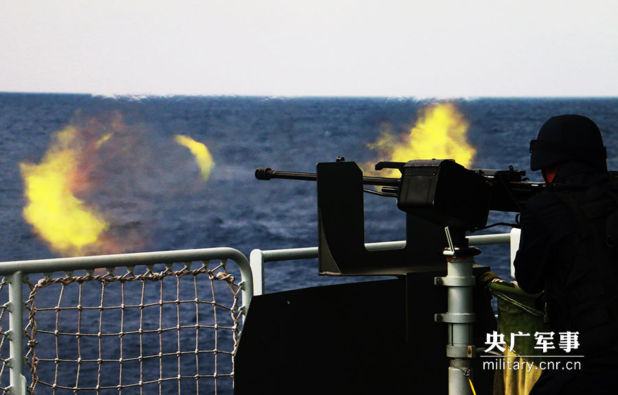 “报告值更官,在我舰方位120度,距离50链,发现海上小目标一批两艘快速向我接近。”演练迅即展开,衡阳舰首先发射9枚红色信号弹对其实施驱离。与此同时,衡阳舰舰载直升机携带特战队员迅速起飞前出查证和拦截。然而,两艘高速小艇继续向被护商船接近。根据编队指令,由特战队员和舰员混合编组的火力小组运用爆震弹对疑似目标实施警告射击。在警告无效的情况下,特战分队迅即运用轻重机枪对其实施拦阻射击。两艘疑似船只仍然高速前行,向被护商船抵近。衡阳舰调整航向,缩小与被护船舶距离,特战分队狙击手携带狙击步枪,占领有利阵位,对目标实施精准狙击,取证小组全程进行摄录像取证。