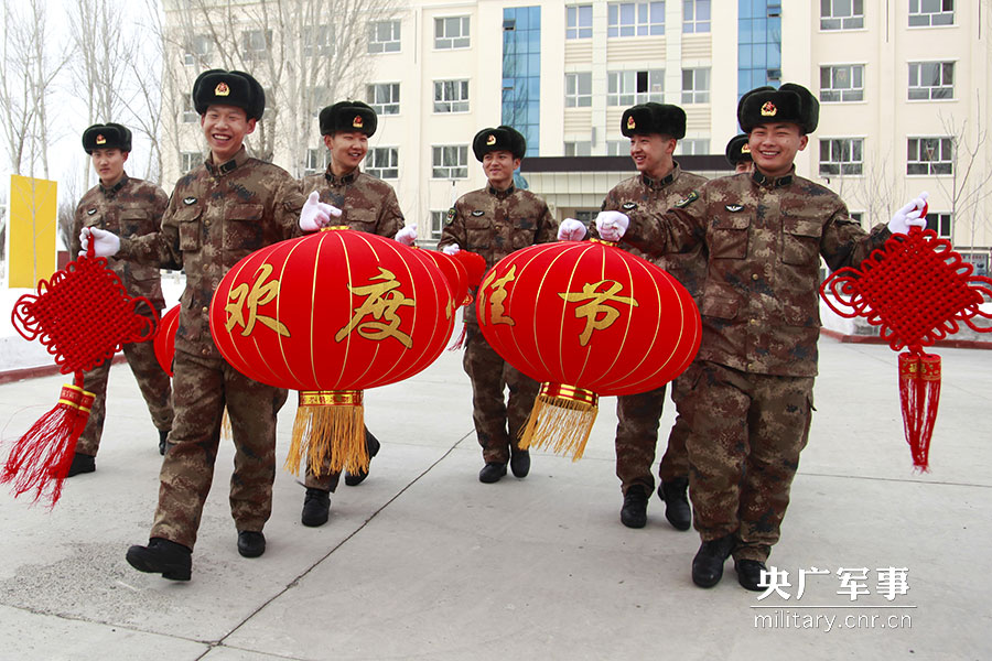 1月24日,在中华民族传统佳节“春节”即将来临之际,新疆塔城军分区新兵团官兵,一起动手挂起灯笼和中国结,为绿色军营添加了红红火火热热闹闹的节日氛围。(肉孜托合提摄影报道)