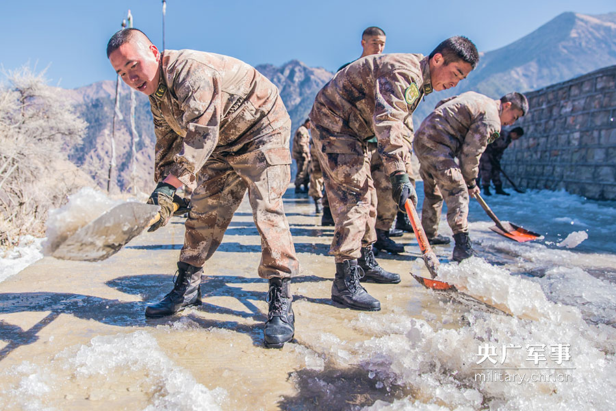 西藏军区林芝军分区某营组织官兵们对结冰路段进行破冰作业