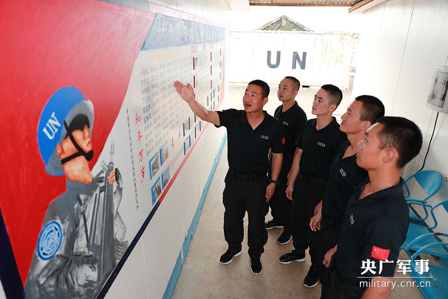 图为“树立安全意识,争当勤务标兵”是防暴队一分队所制板报主题,队员们以“微学习”形式品读板报内容及维和精神。赵小新摄