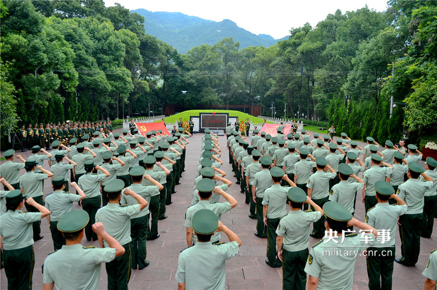 下午16时,歌乐山烈士陵园庄严肃穆。炎炎烈日下,随着主持人的号令,全体官兵深情默哀。随后,在军乐队演奏的《献花曲》旋律中,4名礼兵抬起花篮,缓缓走向烈士墓,将花篮摆放在墓碑两侧。