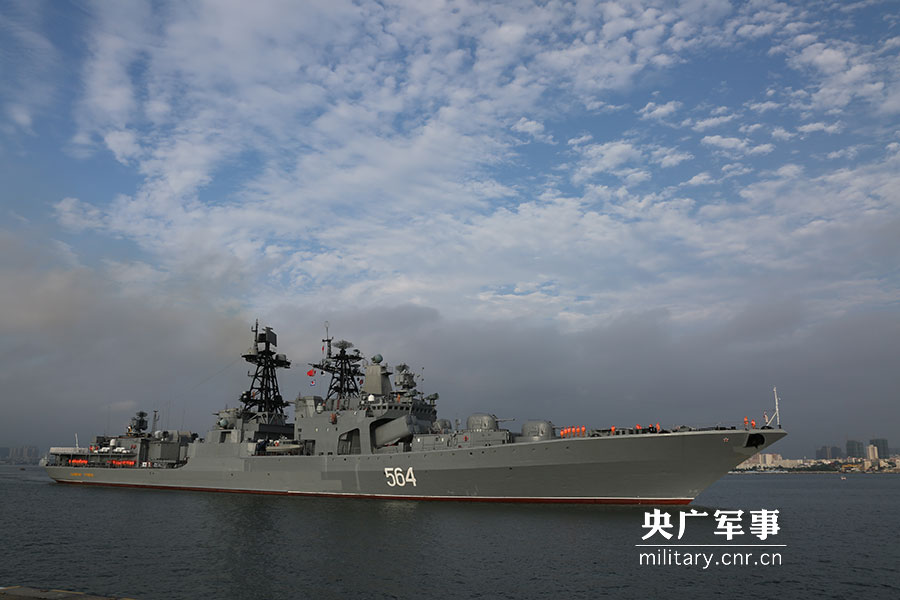 央广网湛江9月12日消息 (记者 纪梦楠)12日上午,参加中俄“海上联合-2016”联演的俄罗斯海军参演舰艇抵达湛江某军港,演习总导演、中国海军副司令员王海中将和俄罗斯海军副总司令费多坚科夫中将,以及演习导演部、指挥部部分人员和中国海军官兵代表到码头迎接。海军在码头举行隆重欢迎仪式,军乐队奏中俄两国国歌。