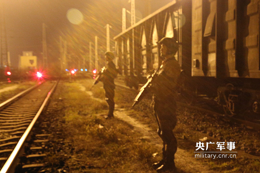 官兵们在夜间到达了一个点,冒着雪在车的两侧警戒。路恒摄