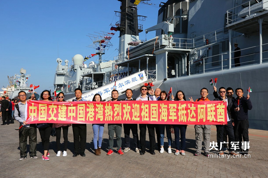 上午9时,编队哈尔滨舰、邯郸舰、东平湖舰缓缓驶入阿联酋阿布扎比港。海军官兵在甲板上整齐列队,中国驻阿联酋大使倪坚、驻迪拜总领事李凌冰、驻阿联酋国防武官由健大校和使领馆工作人员、中资机构工作人员、华人华侨、留学生代表及阿海军官兵代表等600余人在码头迎接。欢迎仪式结束后,倪坚大使一行在哈尔滨舰会议室进行了座谈,并在编队领导的陪同下先后参观了哈尔滨舰和邯郸舰。