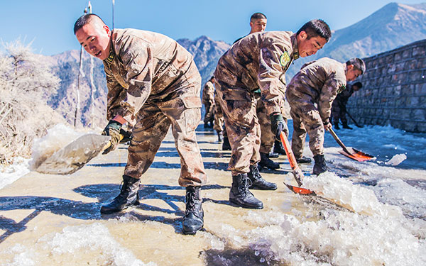 西藏林芝军分区组织官兵道路破冰 保驻地群众安全