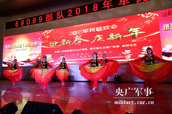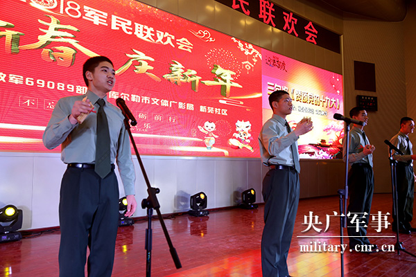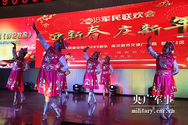 央广网新疆2月13日消息 (罗兴仓)2月12日,新疆军区某训练基地与库尔勒市开发区新苑社区文艺队相聚基地导调大厅,共同举办“迎新春·庆新年”军民联欢会。驻库家属、来队家属、社区居民代表应邀一同观看演出。