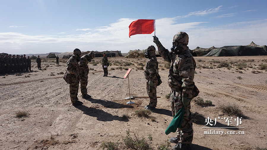 火箭军某部在野外驻训演练期间,组织官兵完成通过“沾染区”科目后,迅速安排人员对通过“沾染区”的官兵进行消毒作业。陈国林 摄