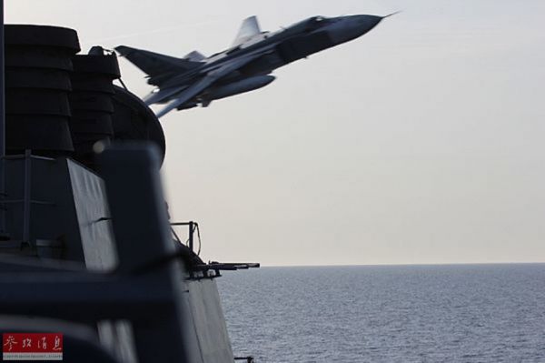 俄罗斯苏-24战机在波罗的海国际水域近距离飞过美国导弹驱逐舰。(资料图)
