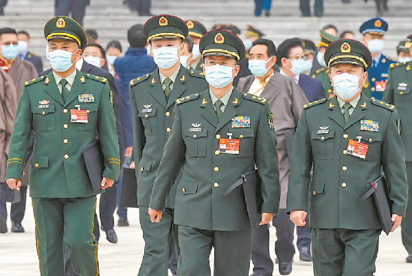 3月5日,十三届全国人大四次会议在北京人民大会堂开幕。图为会议结束后,军队人大代表走出会场(伊霄 摄)