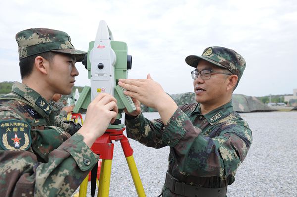 火箭军某导弹旅旅长周勇坤指导官兵操作设备(李鸿林 摄)