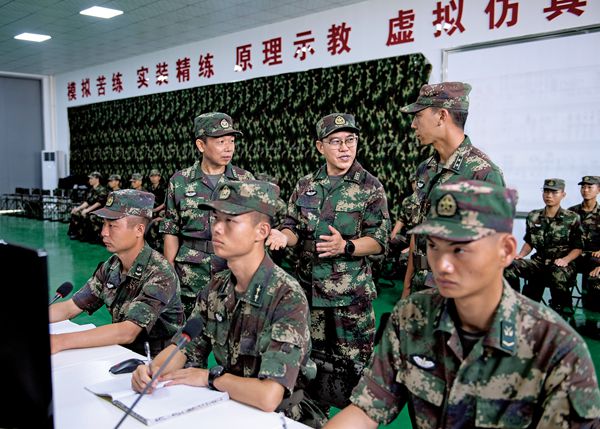 火箭军某导弹旅旅长周勇坤指导官兵进行模拟训练(刘明松 摄)