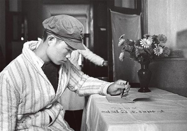 1966年麦贤得伤愈后,右手活动还不方便,他以百折不挠的精神,练习用左手写字(新华社记者邹健东 摄)