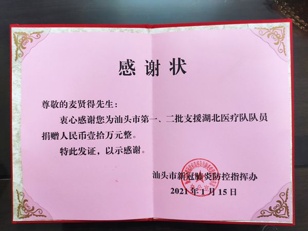 麦贤得为抗疫捐款的证书