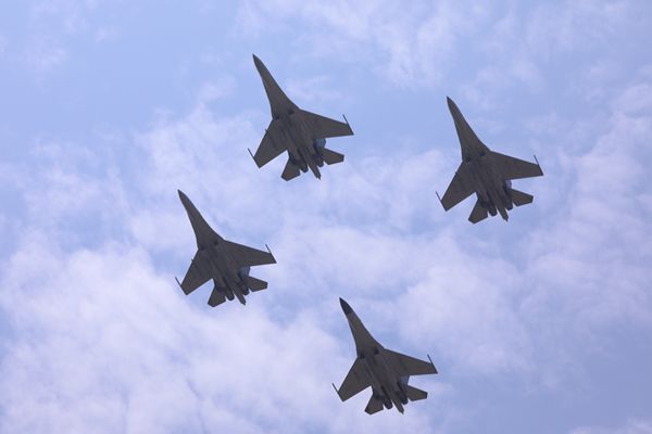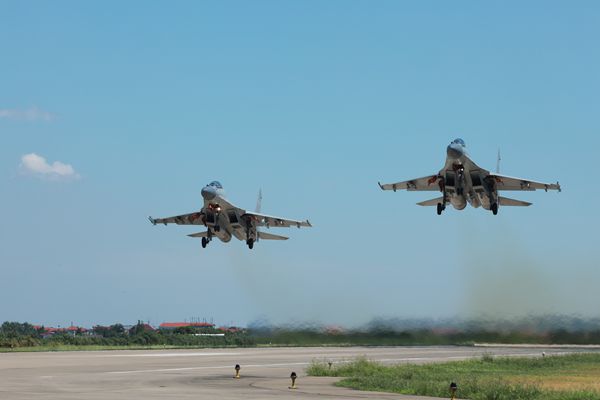 邱麟辉驾驶战机与战友组成双机编队快速起飞(覃柏霖 摄)