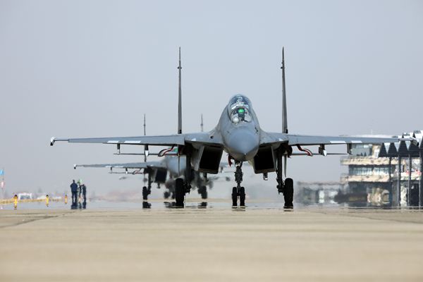 邱麟辉与战友驾驶战机滑向起飞线(胡鸿宾 摄)