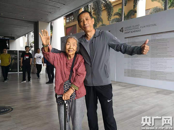 照片中的这位奶奶名叫王群,二十多年前从吉林长春来到海南三亚养老,老伴儿去年102岁时离世。这是王群奶奶刚看完影片走出影厅,和儿子在第二届海南电影节会场合影留念。