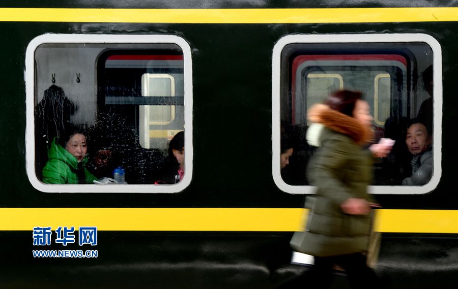1月24日,在郑州火车站,旅客在列车上等待发车时向车外张望。