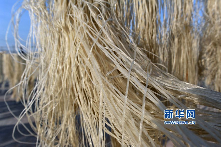 1月19日上午,温暖的阳光渐渐驱散冬日的寒意,看着气温上升,室外挂着的湿毛巾没有冻着,老粉坊的主人陈大林赶紧招呼着大家将冷冻的粉条拿出来解冻,不足半个小时,三四百平方米的晾晒场上就挂满了晶莹透亮的粉条。