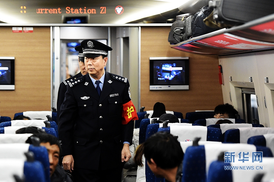 2月2日,郑州乘警支队支队长荆建军在高铁车厢内巡视。