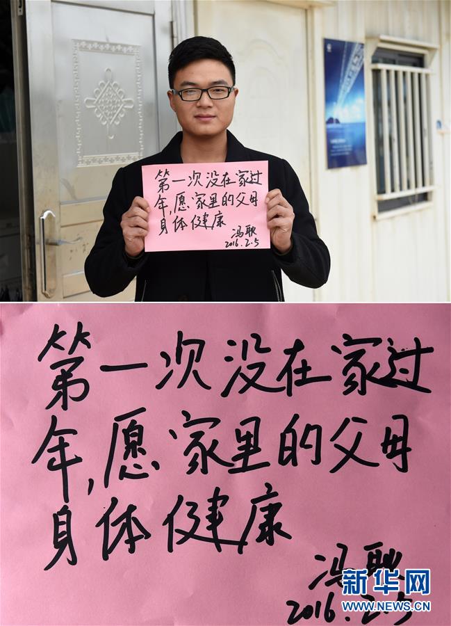 央广网河南分网消息 2月5日,来自河南省驻马店市的冯耿在良庆大桥立交工程建设工地上展示自己的新年寄语(拼版照片)。春节临近,广西南宁市良庆大桥(五象大道)立交工程建设工地的近千名建设者陆续回家了,剩下的几名值班人将在异乡度过这个春节。谈起异乡过新年,他们纷纷拿起纸笔写下心中的感受和新年的祝福。新华社记者陆波岸摄