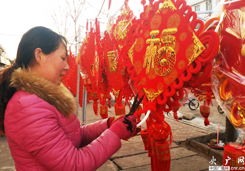 央广网河南分网消息 当日是腊月二十八,民间有腊月二十八家中贴画画的民俗,河南省宝丰县猴年饰品市场红红火火,市民在市场挑选自己满意的过年吉祥物,高高兴兴过大年。王双正摄
