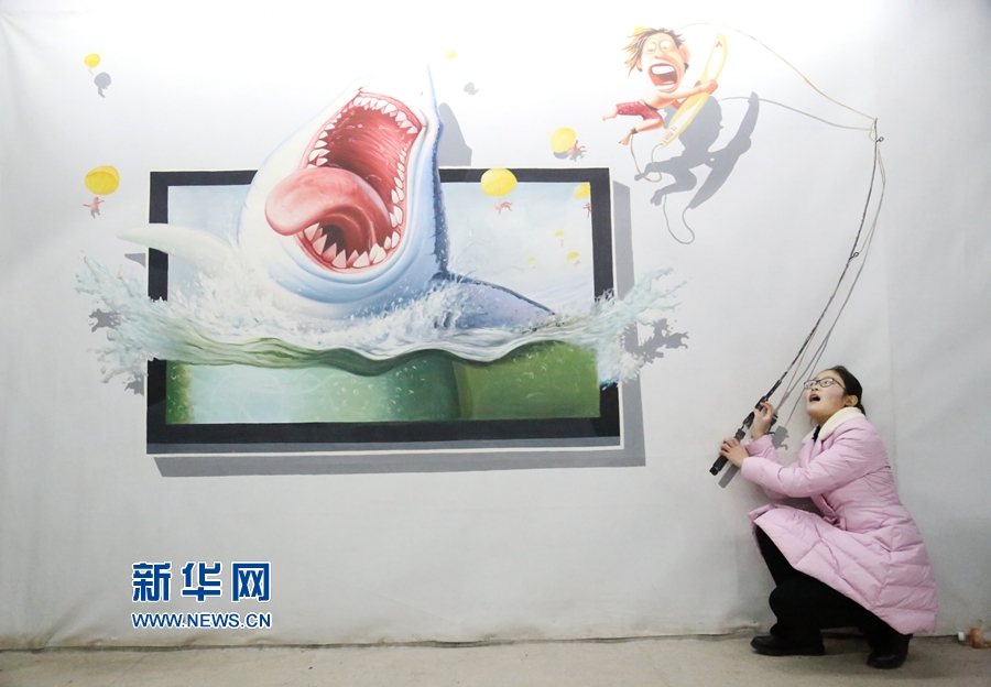 寒假期间,多幅妙趣横生的3D艺术画亮相河南省焦作市影视城,吸引了众多中小学生前来游玩拍照,体验视觉差给人带来的“魔幻”乐趣。新华网发(徐宏星 摄)