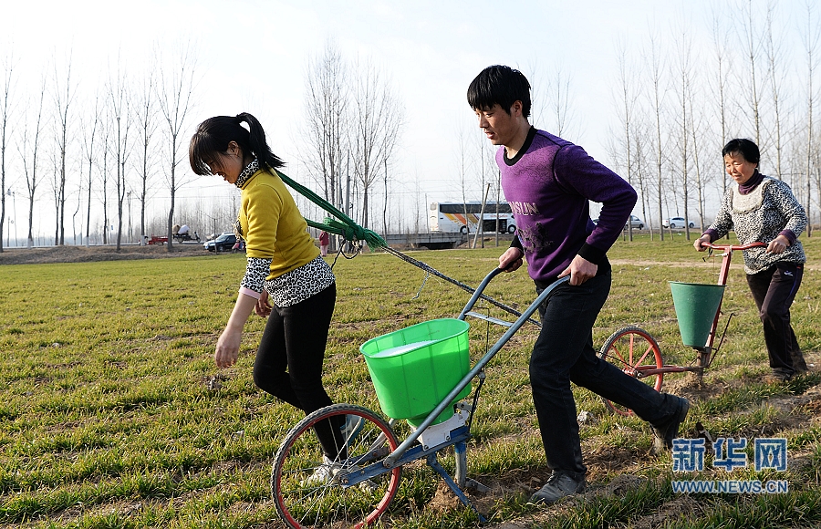 2月18日,在外打工、返乡过年的山东省东明县三春集镇农民王建魁(中)和妻子(左)帮家里春耕。