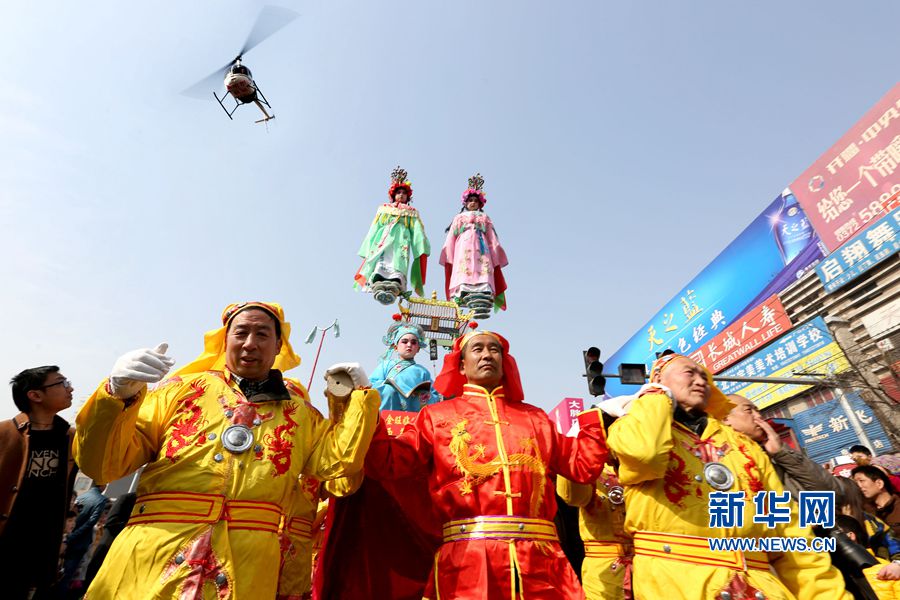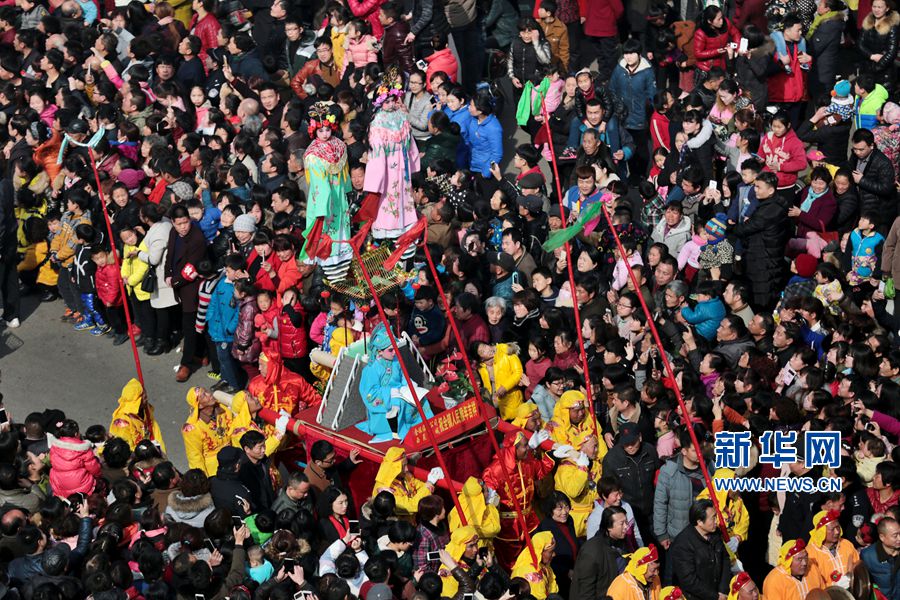 据介绍,抬阁是集历史故事、神话传奇于一体,融绘画、戏曲、彩扎、纸塑、杂技等艺术为一身的汉族传统民俗舞蹈。在木制的四方形小阁里有两三个人扮饰戏曲故事中的人物,由别人抬着游行。抬阁已被列入国家级非物质文化遗产名录。抬阁的种类繁多,各地抬阁的艺术形式各有特色 ,以金坛抬阁、徽州抬阁、广东抬阁、安阳抬阁和山西平阳《抬阁》最为著名。新华网发(毕兴世 马庆祥摄)