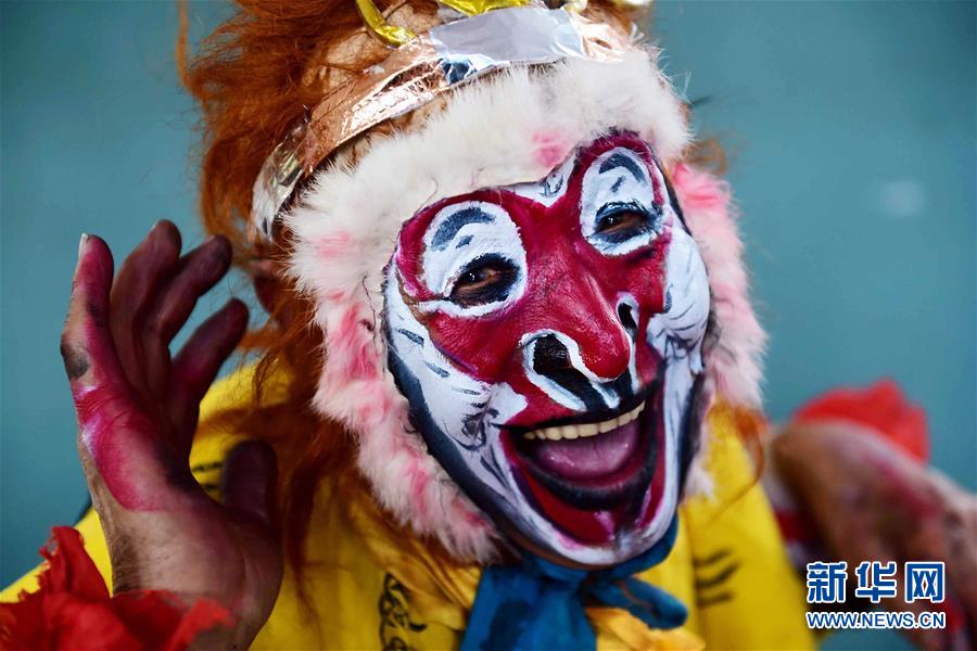 央广网河南分网消息 81岁的“美猴王”何玉久是山东省桓台县人,16岁结缘“猴戏”,师从刘俊文、张恒贯等民间艺人。上世纪五六十年代,何玉久创新脸谱设计,把“倒栽桃形”与“橄榄形”结合起来,将眼窝从十字形改为浓眼圈加眉子,增添了“美猴王”的武生气质。为了将“猴戏”和自己的本领传承下去,2013年起,何玉久受聘于桓台县马桥镇陈庄小学,开设“猴戏”特长辅导班,免费为感兴趣的孩子讲授“猴戏”。新华社记者郭绪雷摄