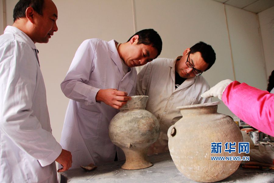 3月2日,在河南内乡县衙博物馆,文物修复师在精心修补文物。