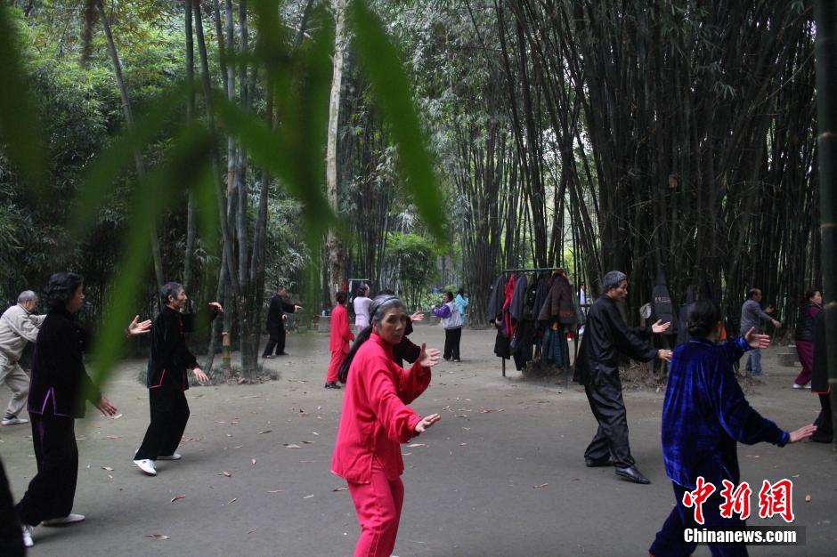 3月17日,成都一公园的竹林里,上百名老人在此练习太极。这些老人每逢天晴便相聚于此,锻炼身体并互相交流太极运动经验。张浪 摄