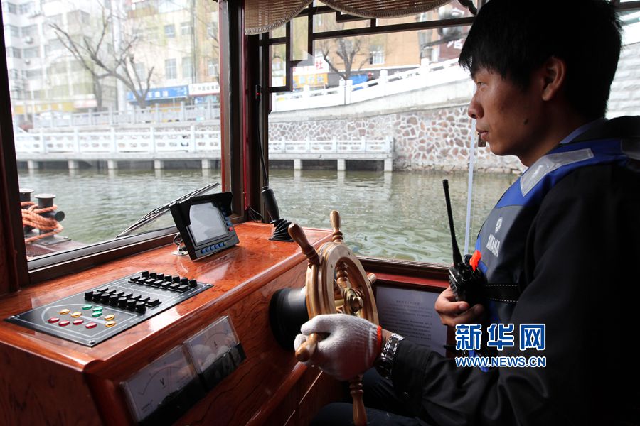 3月15日,河南许昌,一位水上巴士(公交)驾驶员驾驶水上巴士(公交)。
