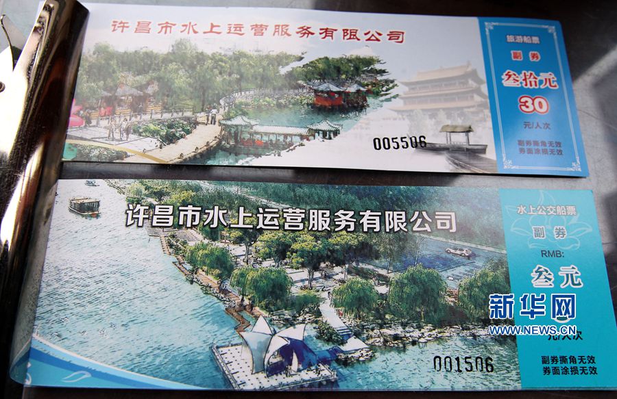 3月15日,河南许昌,水上巴士(公交)及旅游船船票。