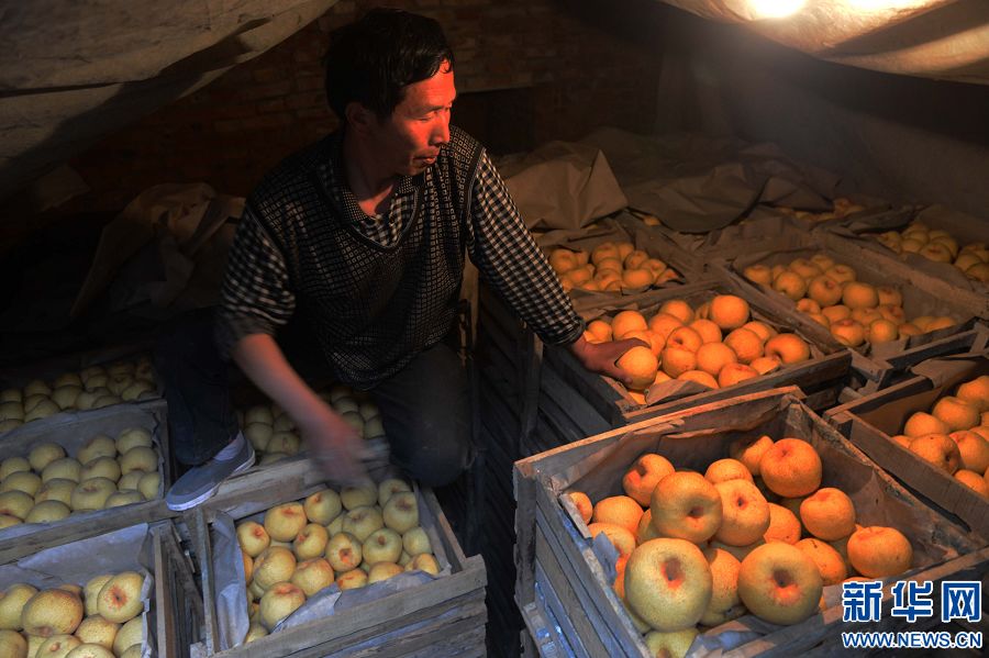 3月17日,宁陵县石桥镇郭岔楼村农民王照清在地窖里查看滞销的酥梨。目前,他家还有两万多公斤梨果没卖出去。