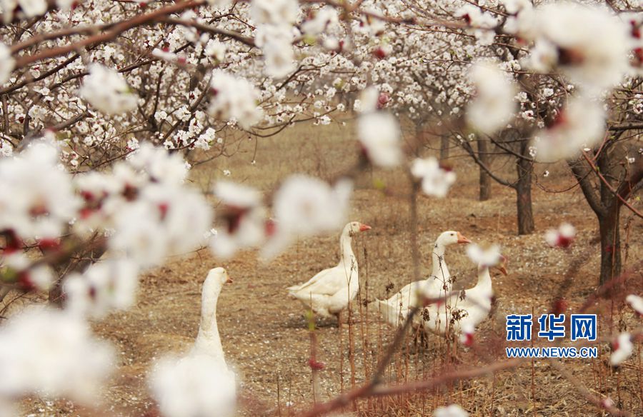 3月20日,在河南省内黄县田间一片杏园下拍摄的大白鹅。阳春三月,内黄县农民林下养殖的鸡、鹅穿梭在盛开的杏花树下觅食,构成了一道美丽生态家园画。新华网发(刘肖坤摄)