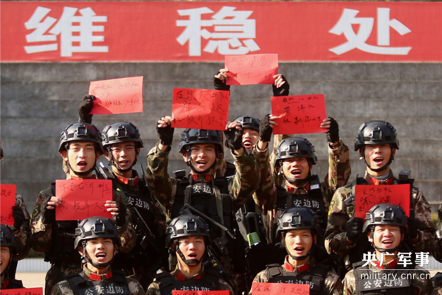 央广网广东2月10日消息(周峰 廖国勇)“祝全国人民新年快乐,猴年行大运!”2月10日上午,笔者走进深圳市银湖山下马塘尾训练基地。刚走到训练场,耳畔响起了震耳欲聋的口号声。广东边防机动支队20名反恐队员们通过用红纸写祝福语的方式,利用执勤休息间隙给全国人民送上新春祝福。