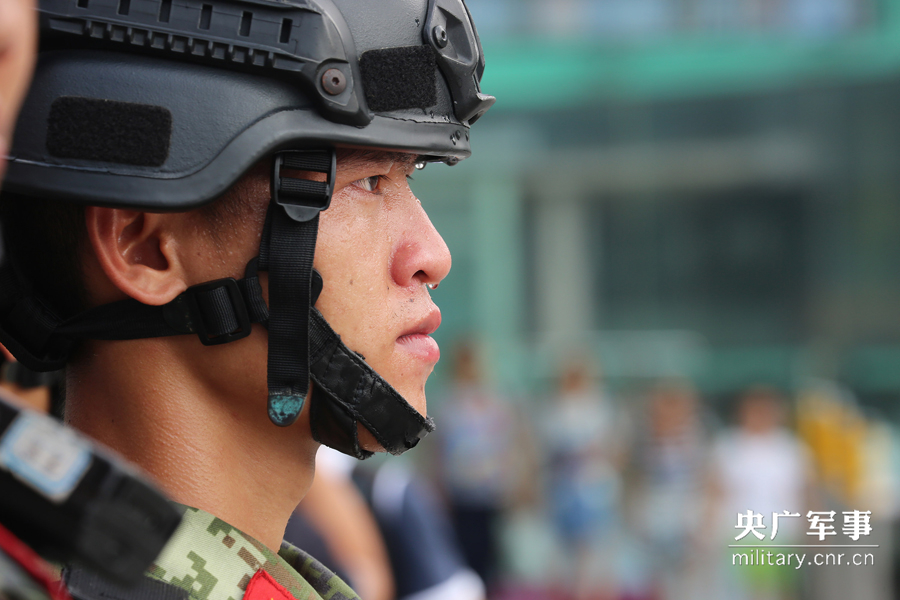 8月8日,一名战士正在认真执勤,汗珠挂满了脸颊。