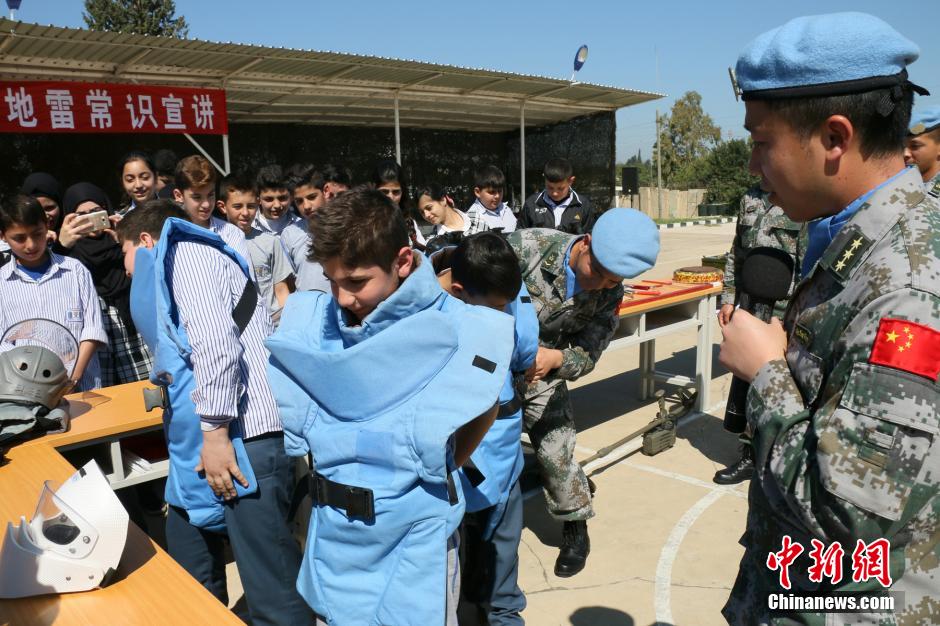 当地时间4月2日,学生们正在试穿扫雷防护服。4月4日是国际提高地雷意识和协助地雷行动日,为了帮助黎巴嫩儿童提高地雷意识,以第14集团军某工兵团为主抽组的赴黎维和部队提前筹划,邀请当地学校的师生来队参加地雷防范知识宣传活动。 中新社发 叶洋萍 摄