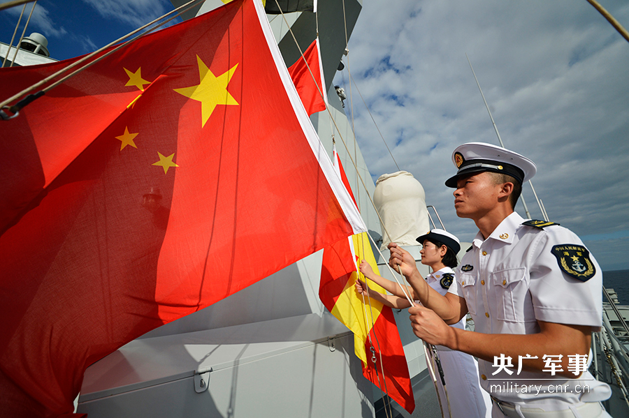 大庆舰信号兵郭喜欢(右)和李月望(左)分别将国旗、海军旗和信号旗组缓缓升起。张海龙摄