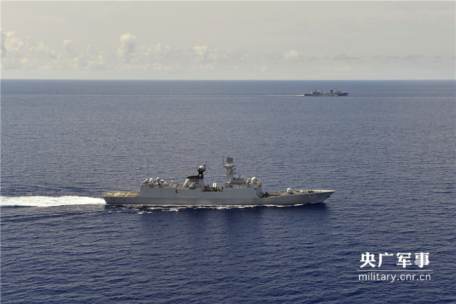 第二十三批护航编队湘潭舰在联合护航演练中为“巢湖”号实施护航警戒。张海龙摄