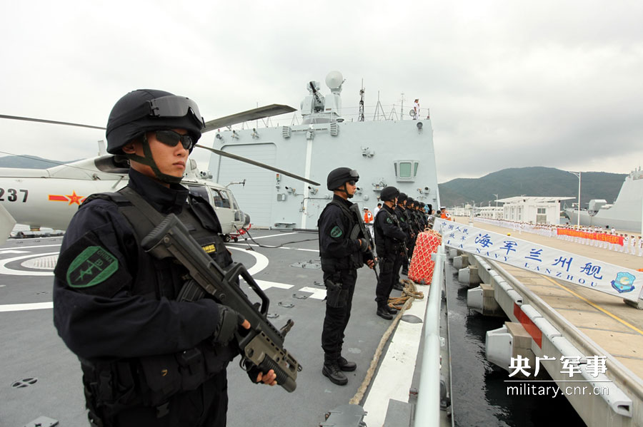 图为启程前特战队员在甲板上持枪列队。陶宏祥摄