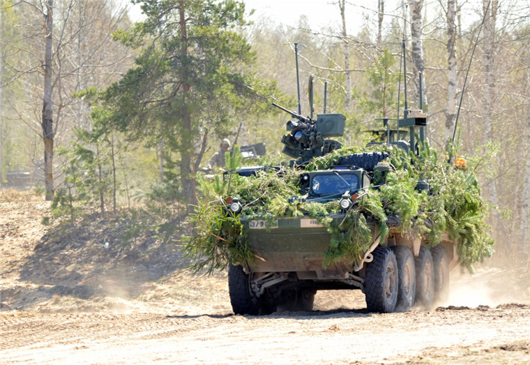 4月28日,在拉脱维亚阿达日军事基地训练场,美军步战车在树林中行进。新华社记者郭群摄