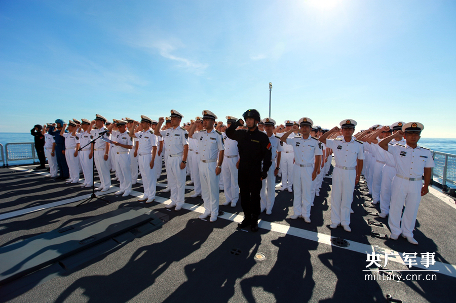 下午16时,参演的全体官兵在兰州舰甲板列队集合,在国歌声中,面对国旗庄严宣誓,向祖国和人民立下“军令状”,表达了不辱使命、不负重托的决心斗志和使命感、自豪感、责任感。