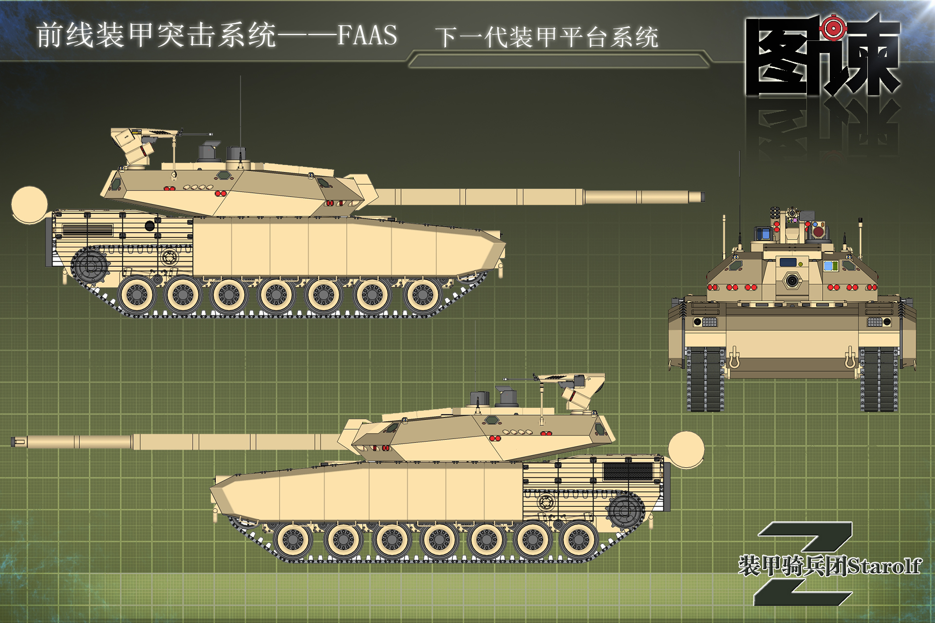 FAAS是采用常规重型履带式底盘搭载无人炮塔的双人制坦克。车体从右前至后分为乘员舱、战斗舱、动力舱三个部分。两名乘员分别是车长和驾驶员,分别位于乘员舱的右侧和左侧;战斗舱包括无人炮塔和位于车体内的自动装弹机,战斗舱与乘员舱及动力舱用装甲隔板完全隔开;后置动力舱安装有一体化的混合动力-电传动动力包及其主油箱。图为三视图 鸣谢微信公众号:利刃