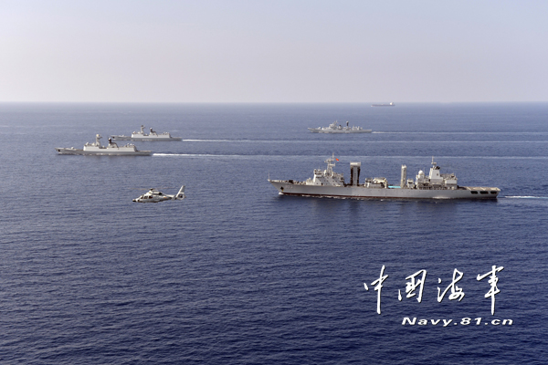 第二十二批护航编队与第二十三批护航编队在分航前进行编队航行。张海龙摄